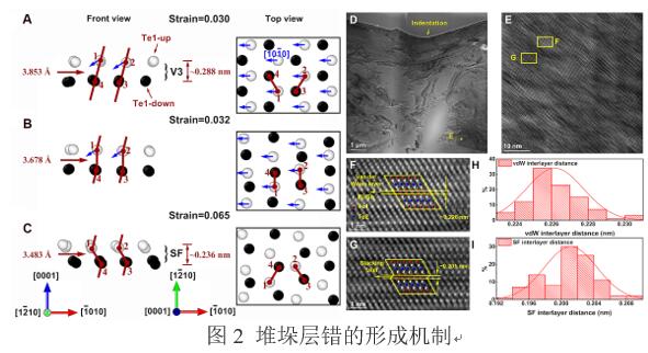 通过第一性原理研究发现,这种不同的结构演化取决于堆垛层错能与解理能之间的竞争关系,高相对密度的堆垛层错模型中,滑移诱导堆垛层错形成比解理更容易,导致结构重组形成具有更小层间距的全堆垛层错结构。