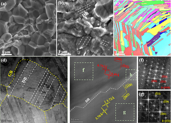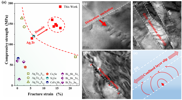 传统无机热电材料的本征脆性,限制了其在微型器件、异形器件及可穿戴电子设备等中的应用。功能材料力学团队基于纳米界面调控策略,通过高压制备结合热锻工艺,成功在碲化银材料中构建了高密度纳米畴界面(图1)。研究表明,纳米畴成核于高能晶界,随后延伸贯穿整个晶粒。畴结构在晶粒内部呈条状分布,畴界面两边均为室温相Ag2Te,不同晶粒中畴界面的生长方向随机。畴界面显著影响位错的成核、限制位错的运动方向(图2),同时影响界面附近的电子态密度并强烈散射声子,使碲化银的压缩强度提升40%、断裂应变提升200%、微热电臂加工性能显著提高、热电优值提升50%。这种利用纳米界面协同调控材料强度-塑性-热电性能的策略,对微型/异形/柔性电子器件的发展具有重要的指导意义。