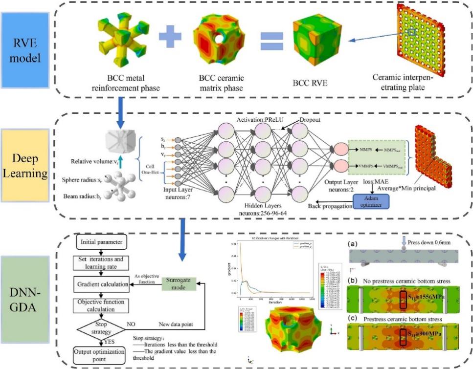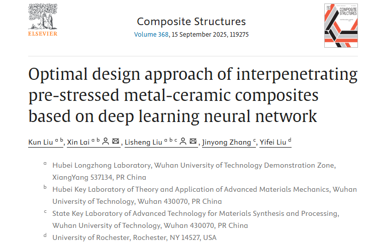 发布时间:2025-06-14近日,*色色视频 计算力学理论与工程应用团队在力学领域顶级期刊Composite Structures(中科院一区Top期刊,IF=6.3)发表了题为“Optimal design approach of interpenetrating pre-stressed metal-ceramic composites based on deep learning neural network”的最新研究成果。论文由刘坤、赖欣、刘立胜、张金咏和刘逸飞合作完成,其中硕士研究生刘坤为第一作者,赖欣副教授、刘立胜教授为通讯作者。这是本校力学学科在CS上发表的一篇重要学术论文,该研究得到了中国国家自然科学基金(52494933,11972267和11802214);湖北省隆中实验室开放基金(2024KF-30);以及中央高校基本科研业务费专项资金(104972024KFYjc0067)的大力支持。这项工作提出了一种基于深度神经网络的预应力金属-陶瓷互穿多孔结构的优化设计框架,旨在提高材料的表观抗拉强度的需求。