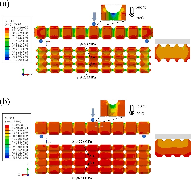 图3:(a)优化前SC单胞的陶瓷基体应力云图;(b)优化后陶瓷基体应力显著减小且分布更加均匀。